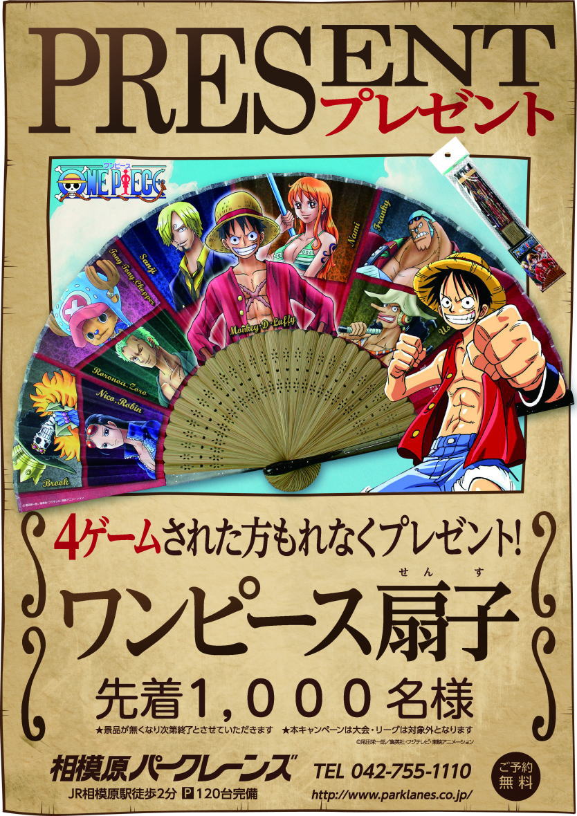 | 4ゲームプレイされた方にもれなく「ワンピース扇子」を差し上げます。 ※大好評のうちに終了しました。ありがとうございました 対象者:大会・リーグ戦以外 キャンペーン開始日:2012年8月22日より キャンペーン終了日:先着1000個で終了 |