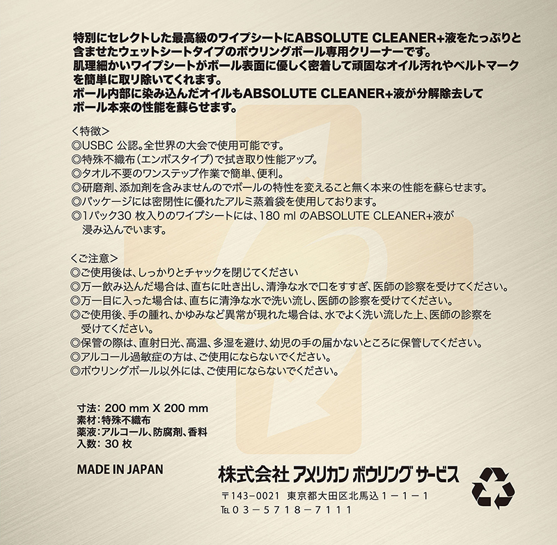 | 商品説明 | ●メーカー:アメリカンボウリングサービス ●特別にセレクトされた最高級のワイプシートにアブソリュートクリーナープラス液をたっぷりと含ませたウェットシートタイプのボウリングボール専用クリーナーです。肌理(きめ)の細かいワイプシートがボール表面に優しく密着して頑固なオイル汚れやベルトマークを簡単に取り除いてくれます。ボール内部に染み込んだオイルもアブソリュートクリーナープラス液が分解除去してボール本来の性能を蘇らせます。 ●特徴 ・USBC公認。世界全ての大会で使用可能です。 ・特殊不織布(エンボスタイプ)で拭き取り性能アップ。 ・タオル不要のワンステップ作業で簡単、便利。 ・研磨剤、添加剤を含みませんのでボール特性を変える事無く本来の性能を蘇らせます。 ・パッケージには密閉性に優れたアルミ蒸着製を使用しております。 ・1パッケージ30枚入りのワイプシートには、180mlのアブソリュートクリーナープラス液が浸み込んでいます。 ●寸法:約200mm×200mm ●素材:特殊不織布 ●薬液:アルコール、防腐剤、香料 ●入数:30枚 |