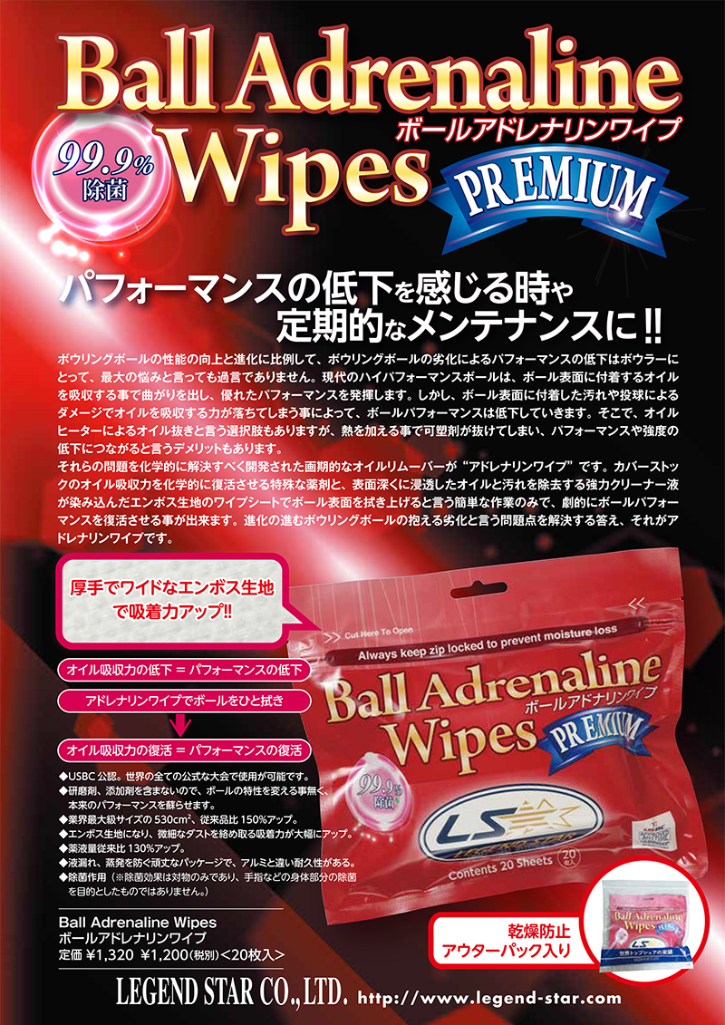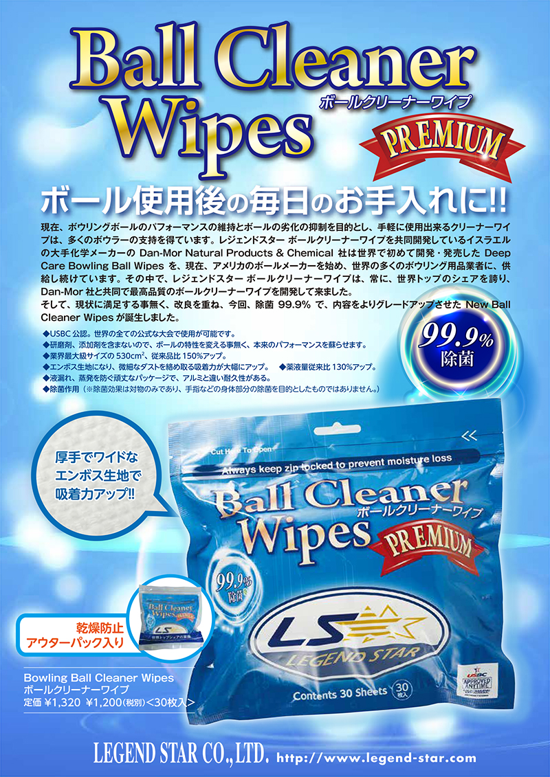 現在、ボウリングボールのパフォーマンスの維持とボールの劣化の抑制を目的とし、手軽に使用出来るクリーナーワイプは、多くのボウラーの支持を得ています。レジェンドスターボールクリーナーワイプを共同開発しているイスラエルの大手化学メーカーの「Dan-Mor Natural Products & Chemical社」は世界で初めて開発・販売した「Deep Care Bowling Ball Wipes」を、現在、アメリカのボールメーカーを始め、世界の多くのボウリング用品業者に、供給し続けています。その中で、レジェンドスターボールクリーナーワイプは、常に、世界トップのシェアを誇り、Dan-Mor社共同で最高品質のボールクリーナーワイプを開発して来ました。 そして、現状に満足する事無く、改良を重ね、今回、除菌99.9%で、内容をよりグレードアップさせた、ニューボールクリーナーワイプが誕生しました。