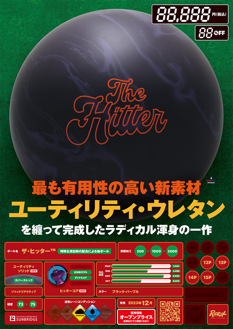 ラディカル創設以来の膨大な研究データを基に構築され運用が開始されたモーションコアデザインプログラムによるコアデザインがスマッシュヒットとなったアウターリミッツ™(2023年4月発売)に継ぐ第2弾として「ザ・ヒッター™」が誕生いたしました。 唯一無二のデザイナーであった故モー・ピネル氏の遺したレガシーを脈々と受け継がれていく中で、まだ見ぬ完璧を目指しての研究は日夜続いております。 そのデザインプログラムが創り出した世にも奇抜な形状をした今作「ヒッター・アシメトリックコア」を使用するコンセプトとして、高いパフォーマンス力と広い汎用性能がメインとなっております。 そのため、新たに開発され今作にて初めて実戦投入となったのが、この新カバーストック「ユーティリティ・ソリッド」なのです。 このカバーはその名の示す通り、実用性を高めるために開発されたモノで、特殊な添加剤の配合によってソリッドタイプの最大の特徴であるオイルへの強さだけではなく、スムーズな直進性を兼ね備えており、全体のボールパフォーマンスは非常にスムーズで全く無駄のない動きを作り出しております。 これはコアシステムとカバーストックのマッチングのよさが完成度の高さを示しているのです。 指からリリースされてからオイルゾーンでの転がりの良さ、そしてしっかりとしたグリップ力を発揮しつつ生み出される直進性能、そして、こちらもより自然にスムーズなアクシス収束によって、どこまでも曲がり続けていくような永続的なフックモーションを描いてピンヒットへと移ります。 その流麗ともいえるフックモーションは投げ手のラインイメージを取りやすく、ミディアムオイリーからミディアムパターンにおいては、無類の強さを発揮することでしょう。 新しい「ユーティリティ・ソリッド」ウレタンの汎用性能が新たな世界のスタンダードになる日は、間違いなく近いと確信しております。