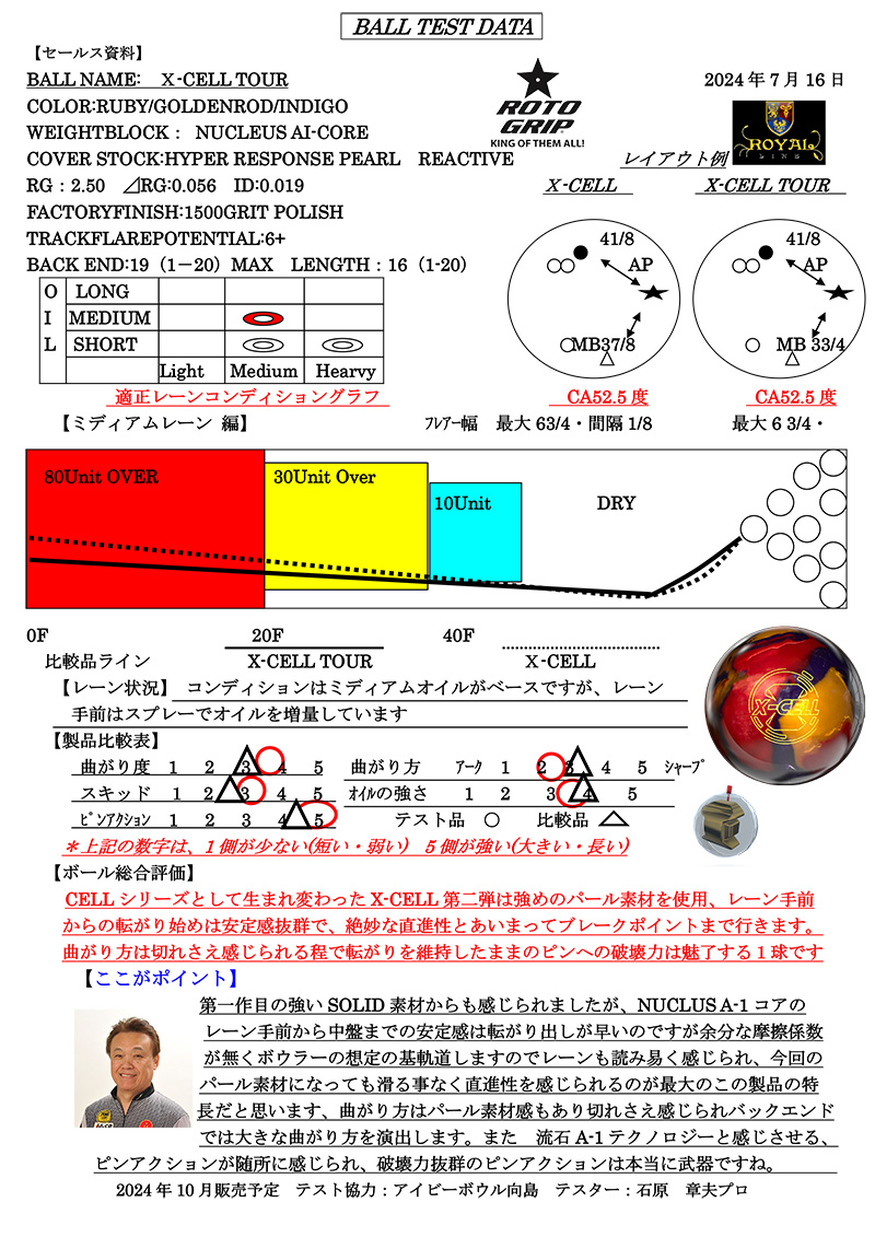 ■テスター石原プロ ボール総合評価 CELLシリーズとして生まれ変わったX-CELL第二弾は、強めのパール素材を使用、レーン手前からの転がり始めは安定感抜群で、絶妙な直進性とあいまってブレークポイントまで行きます。曲がり方は切れさえ感じられる程で、転がりを維持したままのピンへの破壊力は魅了する1球です。