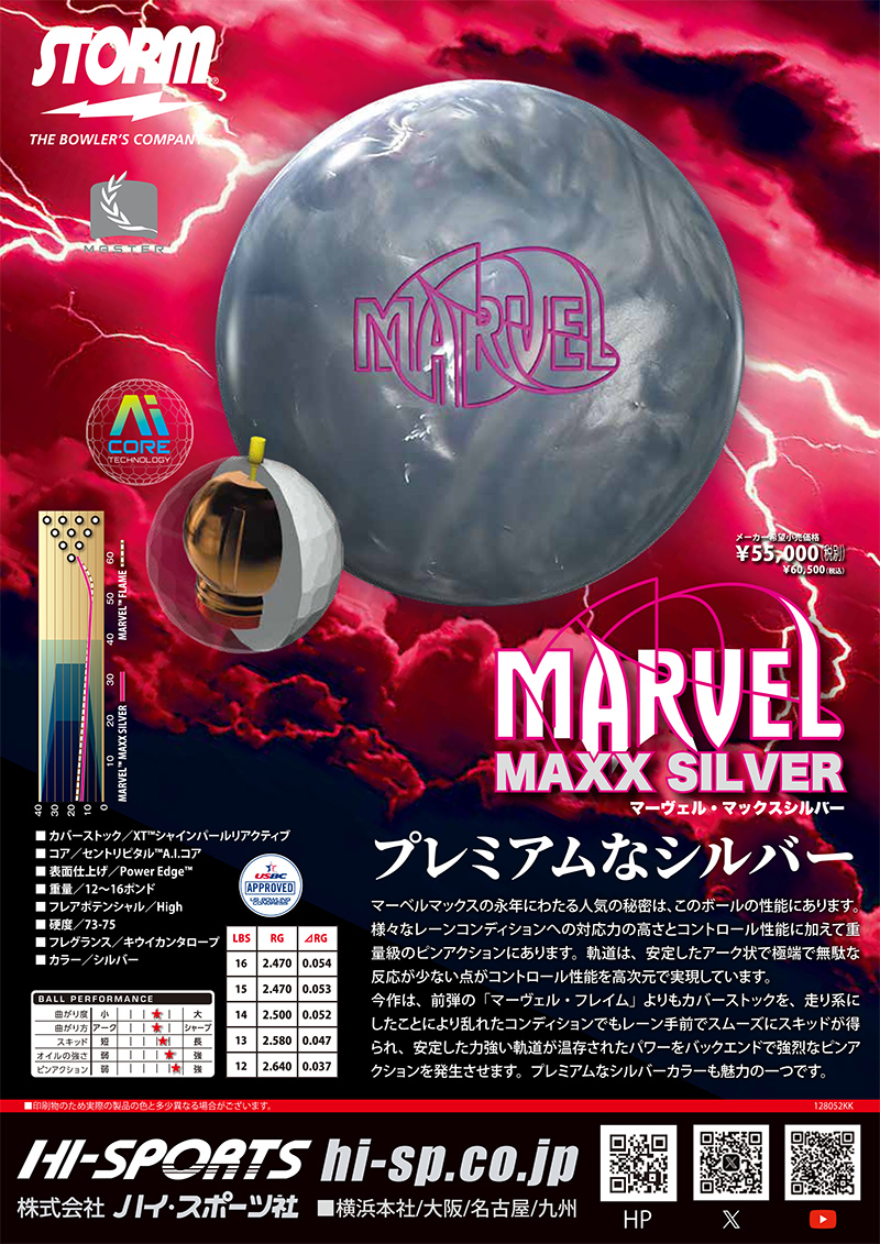 ●レーンコンディションへの対応力とコントロール性能で人気のマーヴェルマックス最新作「マーヴェルマックス・シルバー」。 荒れたコンディションでも手前をスムーズにスキッドし、安定した力強い軌道から、温存されたパワーをバックエンドで開放。強烈なピンアクションを見せる!