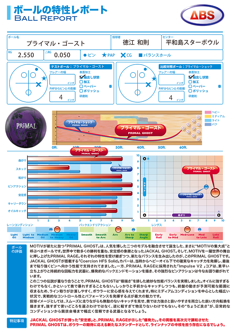 ■ボールの評価(徳江和則プロ)■ MOTIVが新たに放つ「PRIMAL GHOST」は、人気を博した二つのモデルを融合させて誕生した、まさに“MOTIVの集大成”と呼ぶべきボールです。世界中で数多くの勝利を重ね、安定感の象徴となったJACKAL GHOST。そして、MOTIVを一躍世界の舞台に押し上げたPRIMAL RAGE。それぞれの特性を受け継ぎつつ、新たなバランスを生み出したのが、このPRIMAL GHOSTです。 JACKAL GHOSTが搭載する「Coercion HFS Solid」カバーは、当時からヘビーオイル下での確実なキャッチ力を発揮し、最後まで粘り強くピンへ向かう性能で支持されてきました。一方、PRIMAL RAGEに採用された「Impulse V2 」コアは、素早い立ち上がりと持続的な回転力を武器に、爆発的なバックエンドモーションを描き、その強烈なピンアクションは今なお語り継がれています。 この二つの伝説が重なり合うことで、PRIMAL GHOSTは“極端さ”を排した絶妙な性能バランスを実現しました。オイルに強すぎるわけでもなく、かといって奥で暴れすぎることもない。しっかりと手前からキャッチしつつも、終盤の動きが予測可能な範囲に収まるため、ライン取りが計算しやすく、ボウラーに安心感を与えてくれます。特にミディアムコンディションを中心とした幅広い状況で、実戦的なコントロール性とパフォーマンスを発揮する点が最大の魅力です。 投球イメージとしては、スムーズに走りながらも無駄のないキャッチを見せ、奥では力強さと扱いやすさを両立した鋭い方向転換を描きます。強すぎて使いどころを選ぶわけではなく、逆に軽すぎて物足りないわけでもない。その“ちょうど良さ”が、日常的なコンディションから競技会場まで幅広く信頼できる武器となるでしょう。