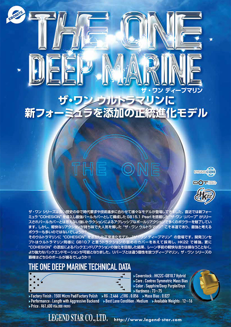 ザ・ワン シリーズは長い歴史の中で時代要求や技術進歩に合わせて様々なモデルが登場してきました。直近では新フォーミュラ“COHESION”を導入し最強パールカバーとして構成したGB15.1 Pearlを搭載した“ザ・ワン リバーブ”がリリースされパールカバーとは思えない強いトラクションによるアグレッシブなボールリアクションで多くのボウラーを魅了しています。しかし、軽快なリアクションが持ち味で大人気を博した“ザ・ワン ウルトラマリン”こそ本道であり、最強と考えるボウラーも多いのではないでしょうか? そのウルトラマリンに“COHESION”を添加した正常進化モデル、“ザ・ワン ディープマリン”の登場です。開発コンセプトはウルトラマリン同様にGB10.7と言うトラクションの弱めのカバーをあえて採用し、HK22で補強。更に“COHESION”の添加によるバックエンドリアクションの強化を目指した結果、レーン手前の軽快な走りは損なうことなく、より強力なバックエンドモーションが可能となりました。リバーブとは違う個性を放つディープマリン。ザ・ワン シリーズの覇権はどちらのボールが握るでしょうか!!