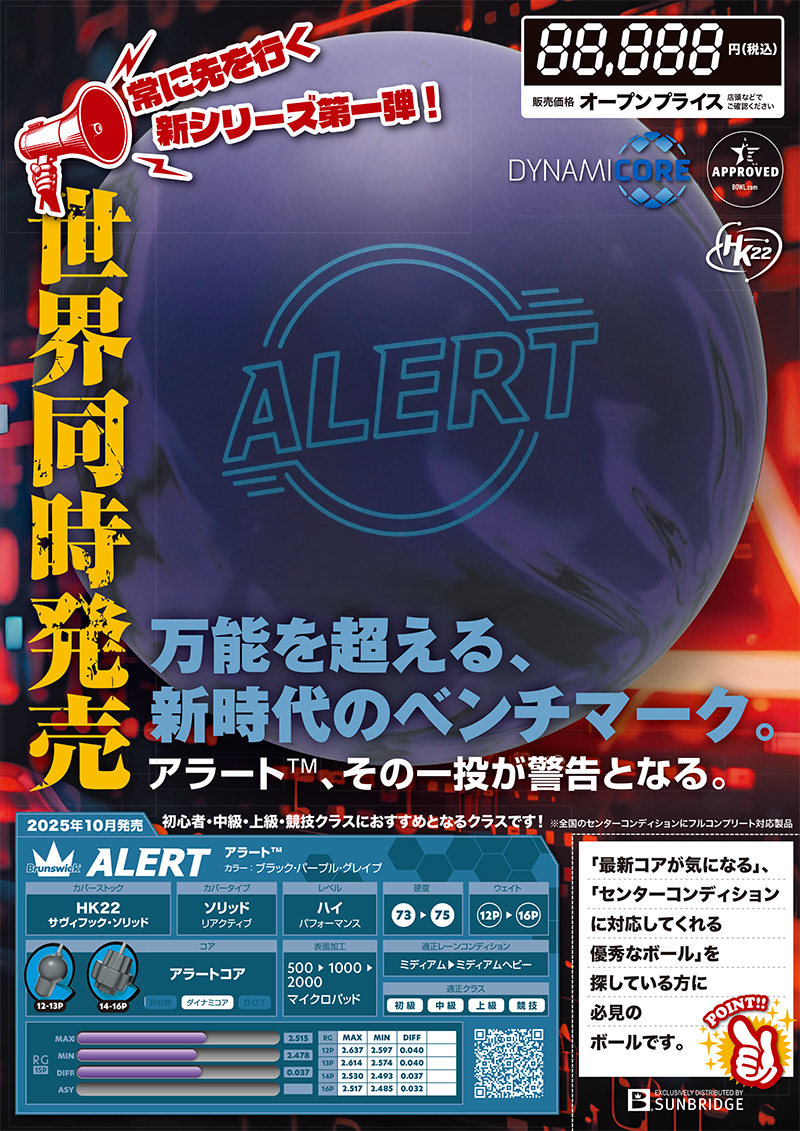 「Brunswick アラート™」は、レーン状況を読み解き、常に一歩先を行くために開発された新シリーズ第一弾です。 名前の通り「警告」を意味し、変化するコンディションを素早く察知して対応できる“早期警戒システム”として設計されました。