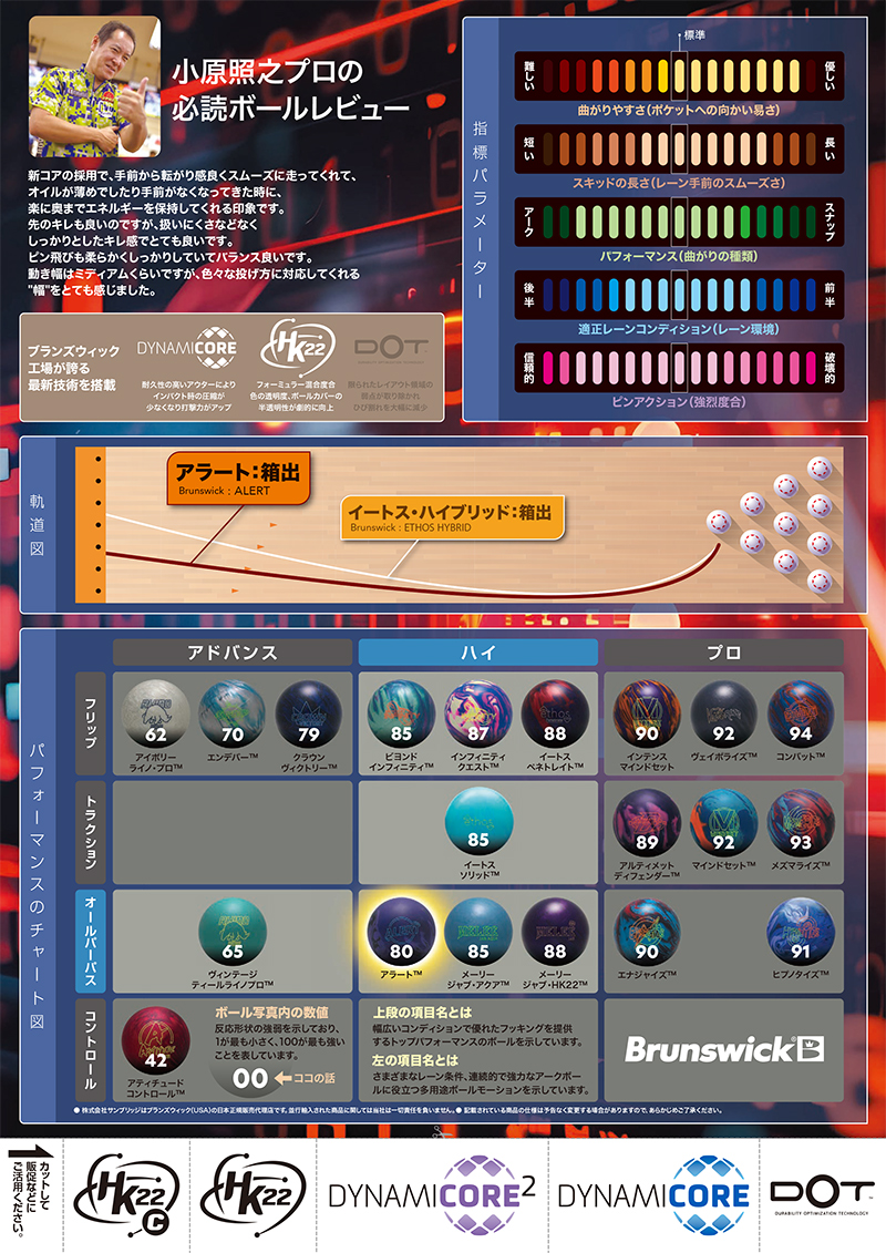 搭載された新開発アラートコアは、低RG:2.478(15lb)と低ディファレンシャル:0.037(15lb)という設計値が特長です。 これにより、手前からしっかりと転がりを生みつつ、バックエンドではアーク状のスムーズで予測可能なモーションを描きます。加えてHK22C・サヴィフックソリッドカバーとの組み合わせは、ミディアムコンディションにおける理想的なコントロールと信頼性を提供してくれます。 さらに#500〜#2000マイクロパッド仕上げにより、オイル上でも安定感が高く、ドライエリアに入っても暴れすぎることなく収束します。