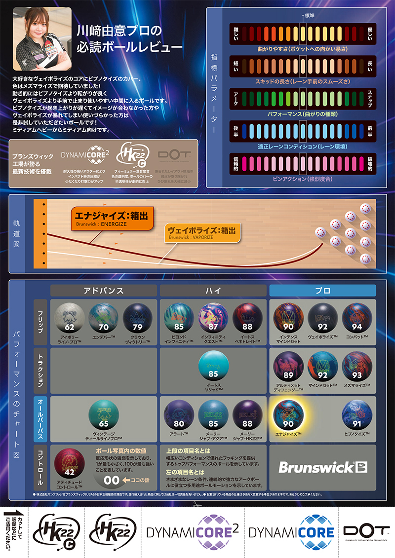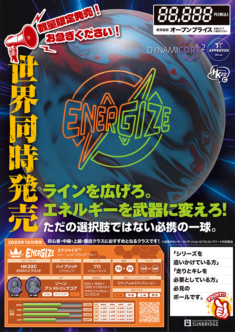 鮮烈なレッド/ブラック/ブルーの3色カラーは視覚的にも転がりを確認しやすく、試合中のライン調整にも貢献。「エナジャイズ™」は「走り」と「キレ」を求める全てのボウラーに、確かな信頼とスコアアップへのエネルギーを与える一球です。