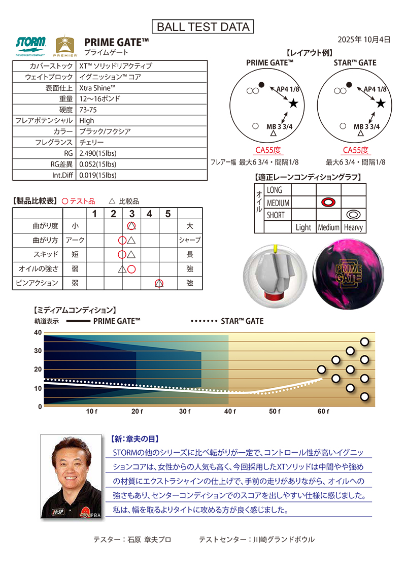 今回採用したXTソリッドは中間やや強めの材質にエクストラシャインの仕上げで、手前の走りがありながら、 オイルへの強さもあり、センターコンディションでのスコアを出しやすい仕様に感じました。