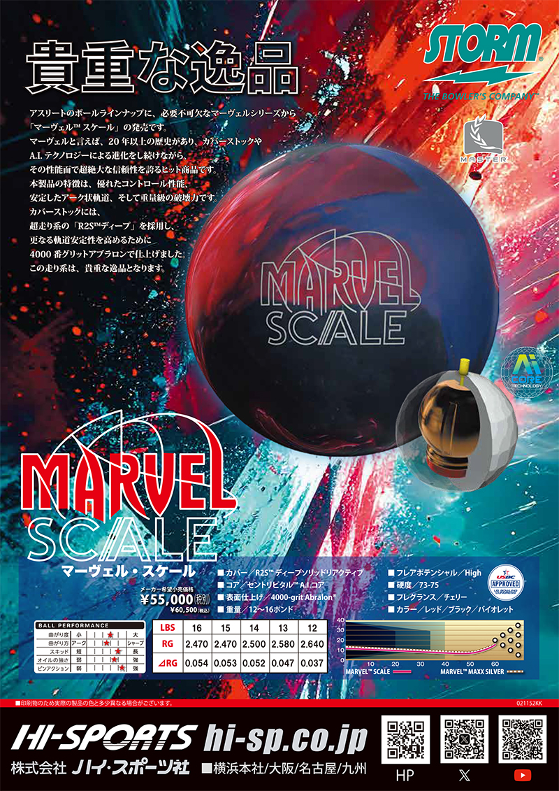 ●競技志向のボウラーに絶大な人気を誇るマーヴェル・シリーズから「マーヴェル™ スケール」が登場。 A.I.化されたセントリピタル™コアと走り系のR2Sディープ・ソリッドの組み合わせが、あなたのボールラインナップにジャストフィット!