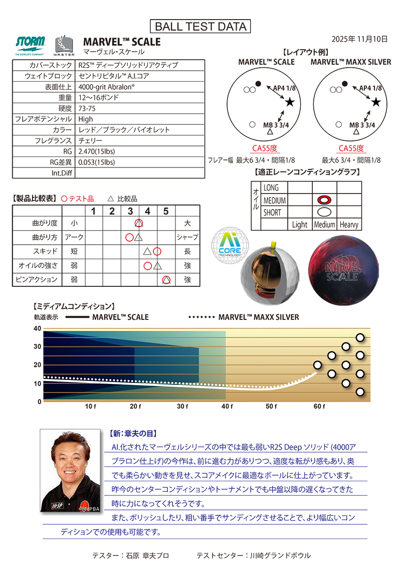 ■テスター石原プロ ボール総合評価 AI.化されたマーヴェルシリーズの中では最も弱いR2S Deep ソリッド (4000アブラロン仕上げ)の今作は、前に進む力がありつつ、適度な転がり感もあり、奥でも柔らかい動きを見せ、スコアメイクに最適なボールに仕上がっています。 昨今のセンターコンディションやトーナメントでも中盤以降の遅くなってきた時に力になってくれそうです。 また、ポリッシュしたり、粗い番手でサンディングさせることで、より幅広いコンディションでの使用も可能です。