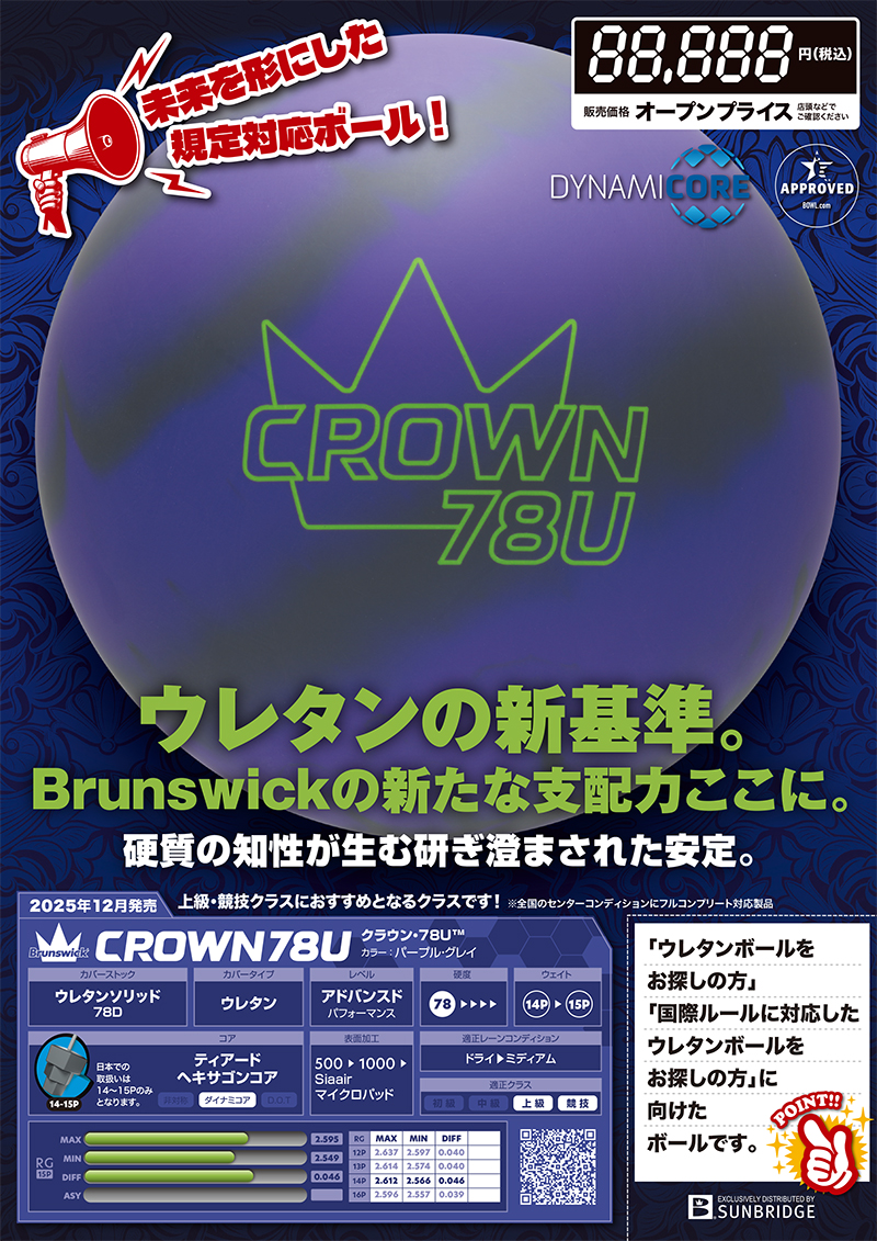 USBCによるウレタンボールの新規定に応え、Brunswickが送り出す「CROWN 78U™」は、まさに“ウレタンの新境地”を切り拓く存在です。硬度78デュロメーターのソリッドウレタンカバーストックを採用し、全国大会での使用を前提に設計されたこのモデルは、規制対応を超えた「競技性能」と「戦略性」を兼ね備えています。