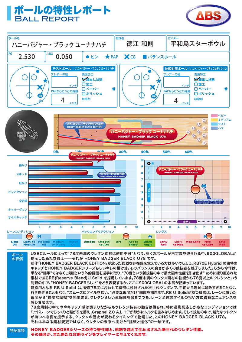 ■ボールの評価(徳江和則プロ)■ USBCルールによって“78度未満のウレタン素材は使用不可”となり、多くのボールが再定義を迫られる中、900GLOBALが提示した新たな答え──それが HONEY BADGER BLACK U78 です。 前作「HONEY BADGER BLACK EDITION」が放った強烈な存在感を覚えている方は多いでしょう。RB70E Hybrid の独特のキャッチとHONEY BADGERシリーズらしいキレの掛け算。そのバランスの良さが多くの競技者を魅了しました。しかし今作は、単なる“継承”ではなく、規制という外的要因を逆手に取り、“78度という新規格の中で最大限の性能を引き出す” ために練り直された素材であるRB(Reserve Blend)U Solid を採用しています。78度未満のウレタン素材の性能から78度以上のウレタンという制限の中で、”HONEY BADGERらしさ”をどう表現するか、ここに900GLOBALの本気が詰まっています。 新採用となる RB U Solid は、硬度78度に合わせて緻密に設計された次世代ウレタンで、手前から過剰に噛みすぎることなく、行き過ぎることもなく、“スムーズにオイルを拾い、”必要な瞬間だけ”輪郭を描きます。RB U Solidが持つ質感は、レーンに置いた瞬間から“適度な摩擦”を発生させ、ウレタンらしい直線性を保ちつつも、レーン全体のオイルの拾い方に独特なニュアンスを感じさせます。 78度規制の中でややキャッチ感は弱まりながらもウレタン特有の動きは得られ、特に過剰反応しがちなコンディションではミッドレーンでじっくりと転がりを蓄え、Grapnel 2.0 A.I. コアが静かにトルクを生みはじめます。そして規制の中で、新たなウレタンが持つべき姿を提示する、ウレタンの歴史が変わるタイミングで登場した、このHONEY BADGER BLACK U78。 それは単なる素材変更ではなく、ウレタンの未来へ向けた“挑戦と進化”の一球です。