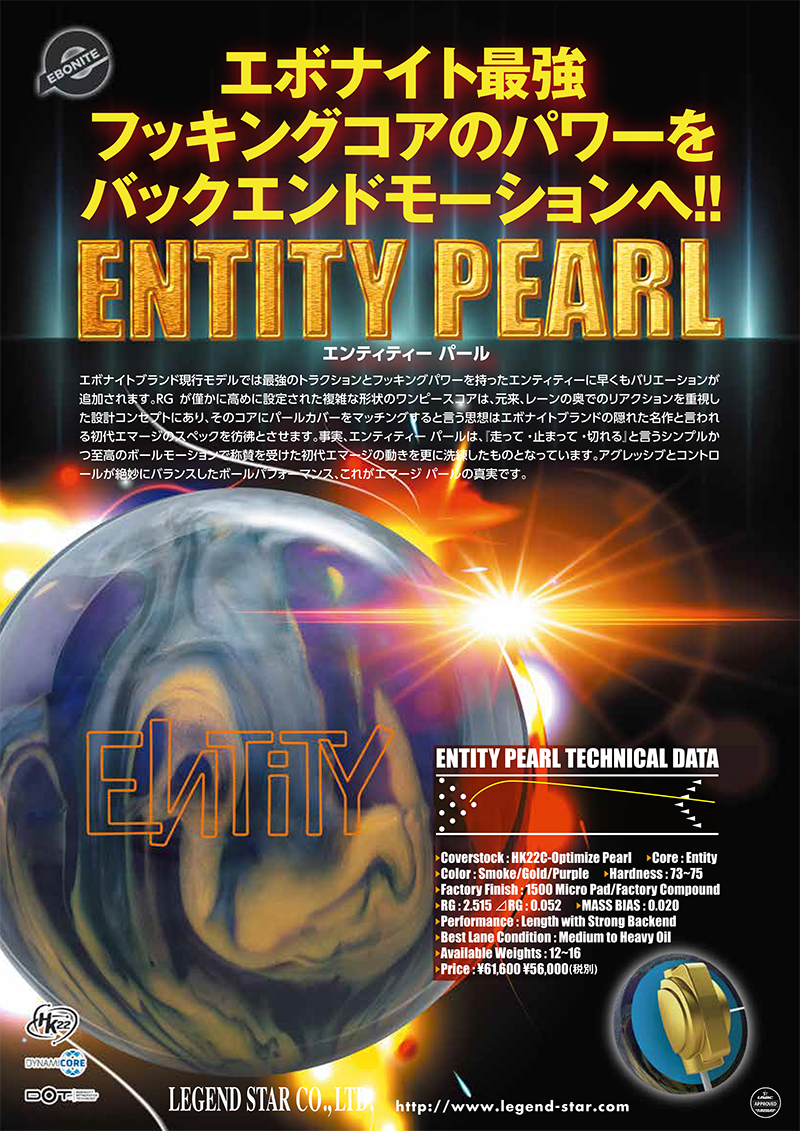 エボナイトブランド現行モデルでは最強のトラクションとフッキングパワーを持ったエンティティーに早くもバリエーションが追加されます。RGが僅かに高めに設定された複雑な形状のワンピースコアは、元来、レーンの奥でのリアクションを重視した設計コンセプトにあり、そのコアにパールカバーをマッチングすると言う思想はエボナイトブランドの隠れた名作と言われる初代エマージのスペックを彷彿とさせます。事実、エンティティー パールは、『走って・止まって・切れる』と言うシンプルかつ至高のボールモーションで称賛を受けた初代エマージの動きを更に洗練したものとなっています。アグレッシブとコントロールが絶妙にバランスしたボールパフォーマンス、これがエマージ パールの真実です。