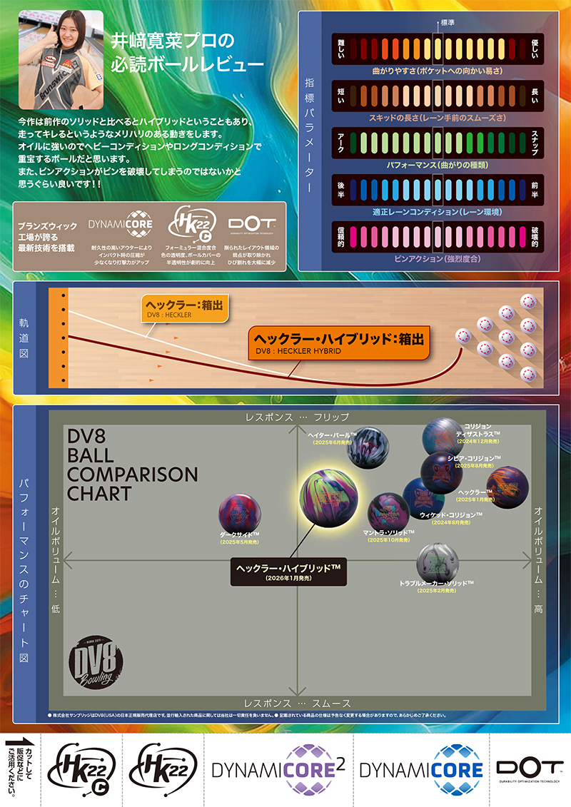 前作で“とにかく曲がる”“ピンが吹き飛ぶ”と話題になったDV8のヘックラーシリーズに、待望のハイブリッド版が登場。 HECKLER HYBRIDは、初代の圧倒的な攻撃性を受け継ぎながら、よりスムーズな走りとメリハリのあるキレを実現した後継モデルです。