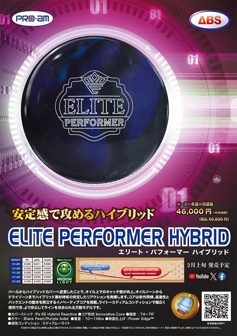 ■ボール特性レポート(徳江和則プロ)■ ELITE PERFORMER HYBRID ―「シリーズの隙間」を埋める、完成度の高い進化形ELITE PERFORMERシリーズは、PRO-amブランドらしい扱いやすさと実戦性能のバランスに優れ、幅広いレベルのボウラーから支持を集めてきました。その中で今回登場するELITE PERFORMER HYBRIDは、前作Pearl仕様から一見シンプルな素材変更に見えながら、実際にはシリーズ全体の完成度を一段引き上げる存在として位置付けられています。 最大の変更点は、カバーストックをPearlからHybridへと変更したところですが、その影響は想像以上に大きいです。 前作のELITE PERFORMER(PEARL)は、走りの良さとバックエンドでの明確な動きが魅力で、ドライ寄りのコンディションや後半戦で力を発揮するモデルでした。一方で、ミッドレーンの安定感やオイル耐性という面では、やや割り切ったモデルでもありました。今回のHybrid化により、レーン手前の直進性を保ちながらも、ミッドレーンで“面で捉える”ような安定感が加わっており、単に早くなるのではなく、「溜め」が効く分、ピン前での動きが素直で、角度を付けても暴れにくい印象です。 現在のPro-amブランドはシリーズ内でのすみ分けも非常に明確で、Solidはオイルのあるコンディションで安心してラインを作れる土台役。Pearlは走りを最大限活かし、後半や薄めのオイルで威力を発揮する切り札。そしてこのHybridは、その中間に位置しながらも、最も使用頻度が高くなり得る“万能ゾーン”を担っています。また、同シリーズとして発売されているFLEX ZONEやSPEED STRIKER PEARLとの差別化もはっきりしており、FLEX ZONEがレーン変化に強く、コントロール性を重視したモデルであるのに対し、ELITE PERFORMER HYBRIDはより俊敏な反応と安定感との両立を目指し、汎用性に寄せた設計。 SPEED STRIKER PEARLのような鋭さやキレを前面に出すのではなく、ライン取りの幅と安定感で勝負するボールと言えるでしょう。