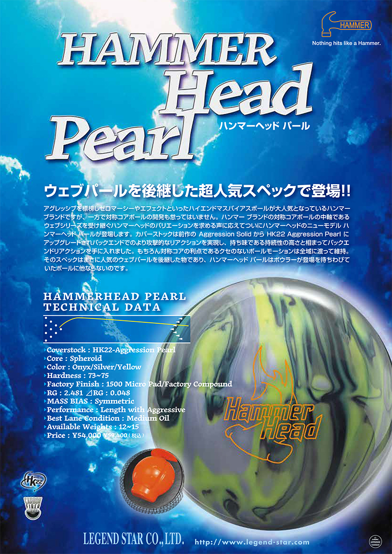 アグレッシブを標榜しゼロマーシーやエフェクトといったハイエンドマスバイアスボールが大人気となっているハンマー ブランドですが、一方で対称コアボールの開発も怠ってはいません。ハンマー ブランドの対称コアボールの中軸であるウェブシリーズを受け継ぐハンマーヘッドのバリエーションを求める声に応えてついにハンマーヘッドのニューモデル ハンマーヘッド パールが登場します。カバーストックは前作のAggression Solid からHK22 Aggression Pearlにアップグレードされバックエンドでのより攻撃的なリアクションを実現し、持ち味である持続性の高さと相まってバックエンドリアクションを手に入れました。もちろん対称コアの利点であるクセのないボールモーションは全域に渡って維持。そのスペックはまさに人気のウェブパールを後継した物であり、ハンマーヘッド パールはボウラーが登場を待ちわびていたボールに他ならないのです。