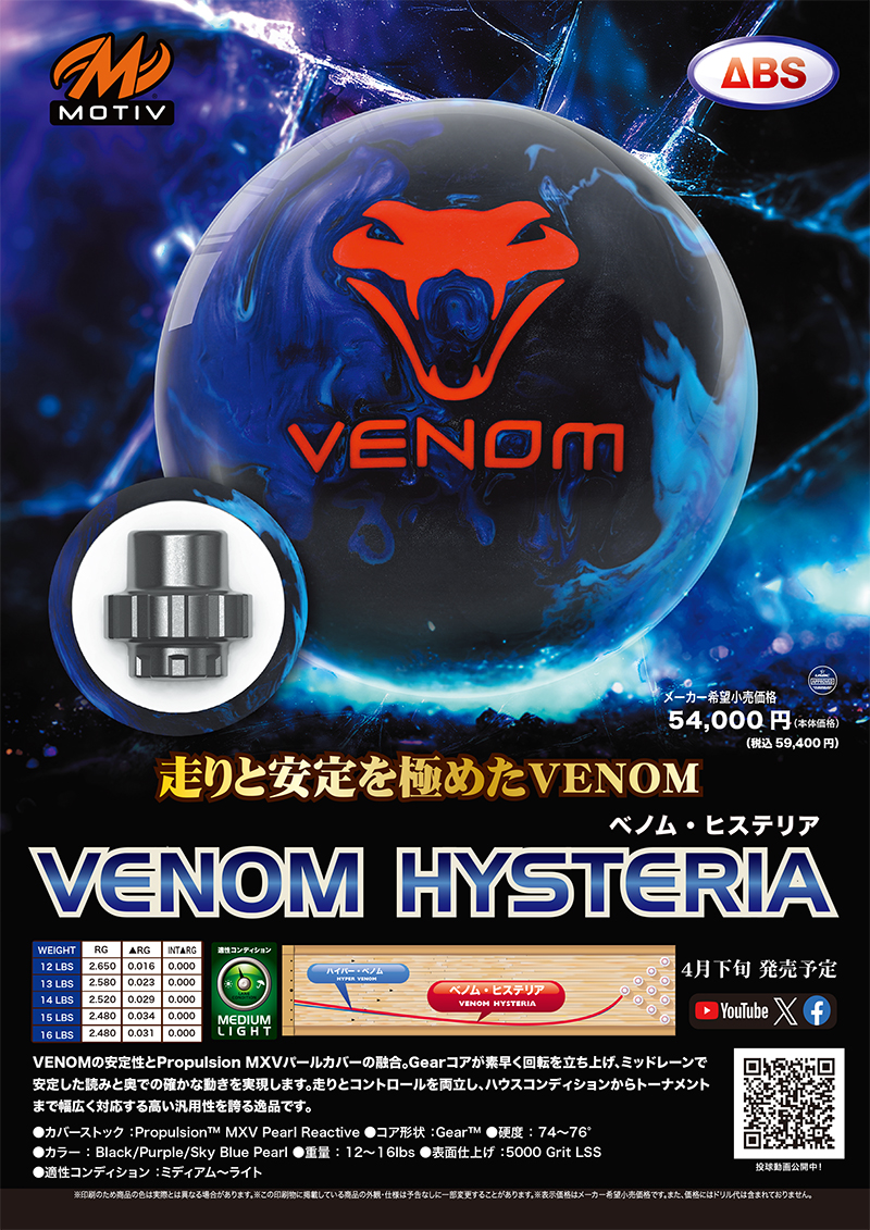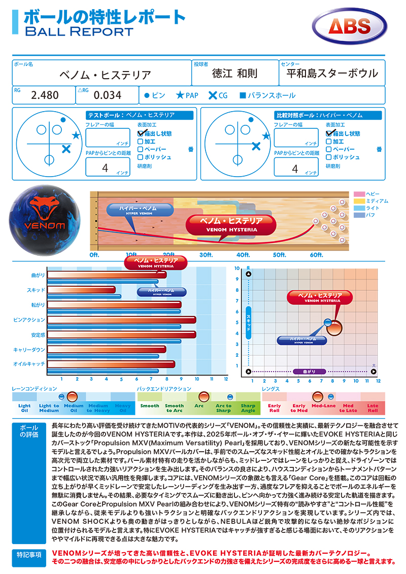 ■ボールの評価(徳江和則プロ)■ 長年にわたり高い評価を受け続けてきたMOTIVの代表的シリーズ「VENOM」。その信頼性と実績に、最新テクノロジーを融合させて 誕生したのが今回のVENOM HYSTERIAです。本作は、2025年ボール・オブ・ザ・イヤーに輝いたEVOKE HYSTERIAと同じ カバーストック「Propulsion MXV(Maximum Versatility) Pearl」を採用しており、VENOMシリーズの新たな可能性を示す モデルと言えるでしょう。Propulsion MXVパールカバーは、手前でのスムーズなスキッド性能とオイル上での確かなトラクションを 高次元で両立した素材です。パール素材特有の走りを活かしながらも、ミッドレーンではレーンをしっかりと捉え、ドライゾーンでは コントロールされた力強いリアクションを生み出します。そのバランスの良さにより、ハウスコンディションからトーナメントパターン まで幅広い状況で高い汎用性を発揮します。コアには、VENOMシリーズの象徴とも言える「Gear Core」を搭載。このコアは回転の 立ち上がりが早くミッドレーンで安定したレーンリーディングを生み出す一方、過度なフレアを抑えることでボールのエネルギーを 無駄に消費しません。その結果、必要なタイミングでスムーズに動き出し、ピンへ向かって力強く進み続ける安定した軌道を描きます。 このGear CoreとPropulsion MXV Pearlの組み合わせにより、VENOMシリーズ特有の“読みやすさ”と“コントロール性能”を 継承しながら、従来モデルよりも強いトラクションと明確なバックエンドリアクションを実現しています。シリーズ内では、 VENOM SHOCKよりも奥の動きがはっきりとしながら、NEBULAほど鋭角で攻撃的にならない絶妙なポジションに 位置付けられるモデルと言えます。特にEVOKE HYSTERIAではキャッチが強すぎると感じる場面において、そのリアクションを ややマイルドに再現できる点は大きな魅力です。
