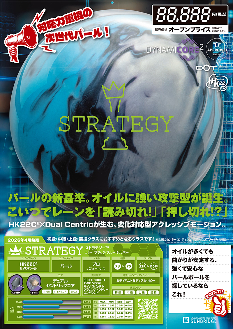 Brunswick Pro Performanceラインに新たに加わる「STRATEGY™」は、トランジション初期から中盤にかけて最も信頼できる“対応型パール”として設計されたモデルです。 新開発Dual Centric非対称コア(RG2.50/Diff0.047/Int0.016)は、適度な軸移動量と安定した回転持続を両立。 HK22C² – EVO Pearlとの組み合わせにより、従来のパール素材にはなかったミッドレーンでの読みとオイル耐性を獲得しました。