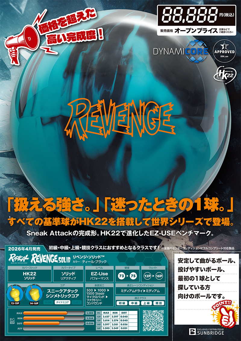 ■REVENGE SOLID HK22 Solidはミッドレーンでの安定したロール形成に優れ、過敏な反応を抑えながらも持続的に曲がり続けるコントロール型リアクションを提供。 フレッシュからトランジションまで幅広く対応し、ベンチマークボールとして最適です。